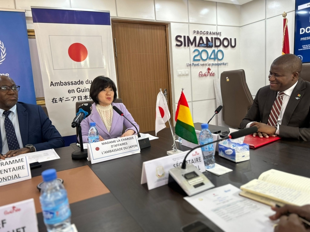 4月1日、首都コナクリにて、令和7年度対ギニア無償資金協力「食糧援助(WFP連携)」の式典が開催されました。本式典には、鍋島德子在ギニア共和国日本国臨時代理大使、ナベ計画・国際協力・開発大臣、及びウセングムレミ国際連合世界食糧計画(WFP)ギニア事務所代表が出席しました。